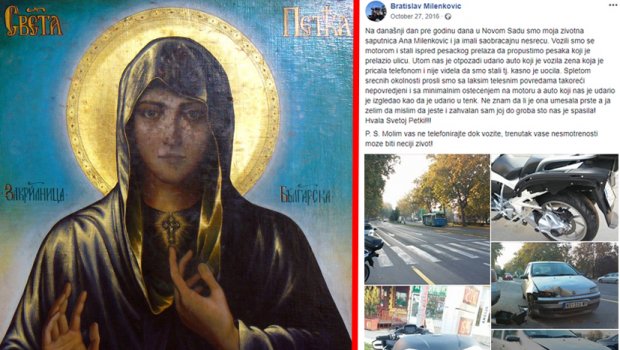 Spletom srećnih okolnosti prošli smo sa lakšim telesnim povredama takoreći nepovređeni i sa minimalnim oštećenjem na motoru, a auto koji nas je udario je izgledao kao da je udario u tenk. Ne znam da li je ona umešala prste, a ja zelim da mislim da jeste i zahvalan sam joj do groba sto nas je spasila! Hvala Svetoj Petki!!!