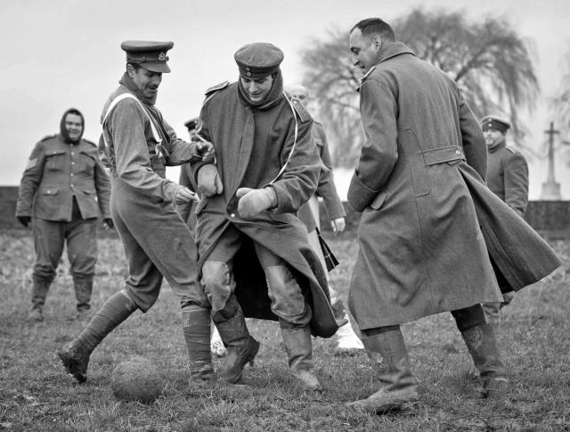 Vek kasnije britanski i nemački vojnici i dalje imaju priliku da igraju fudbal zajedno za Božić, ali sada kao saveznici.