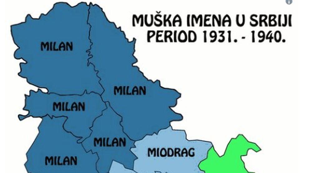 U periodu od 1931. do 1940. godine najpopularnije ime bilo je Milan i to skoro u celoj Srbiji. Jedino su na istoku Srbije popularniji bili Miodrag i Jovan, kao i Stojadin u jednom delu južne Srbije. Za KiM nema podataka.