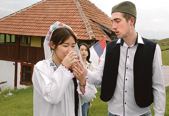 – Na početku svadbe delimo uloge i objašnjavamo pravila. Jedna grupa, sa ženom koja se prijavi za udaju, ide mladinoj kući, ova druga, sa mladoženjine strane, odlazi njegovoj kući. Mladu oblače deveruše, dve-tri Kineskinje i još toliko naših, i spremaju za venčanje. U to vreme iz mladoženjine kuće kreće povorka svatova. Pešače 500-600 metara, prati ih muzika, pevaju svadbarske pesme. Da bi ušli u mladino dvorište, treba da obore jabuku, s tim što umesto puške kod nas pukne petarda – potanko objašnjava Željko Sredić.