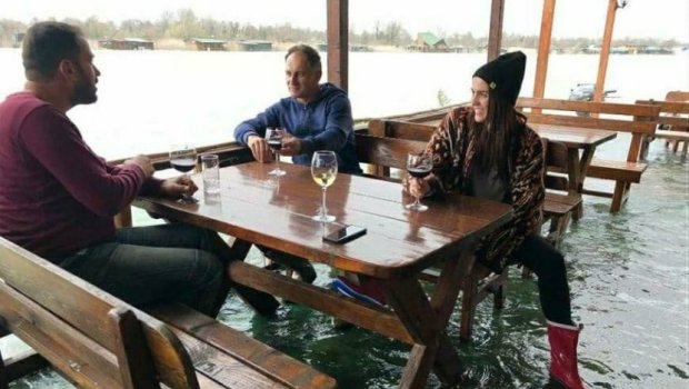 Naime, dva momka i devojka sede za stolom, oko njih sve pluta, a oni u gumenim čizmama najopuštenije piju vino.