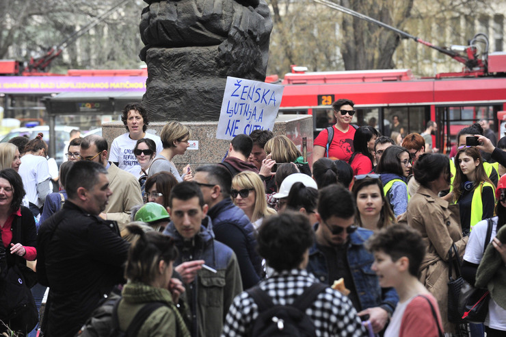 Aktivistkinje organizacija za prava žena okupile su se danas, povodom 8. marta, na protestnom maršu u centru Beograda. Žene, ali i muškarci među njima, krenuli su u šetnju sa platoa ispred Filozofskog fakulteta, gde su prethodno pojedine aktivistkinje okačile i kecelju oko spomenika Njegošu sa porukom “Podržavam ženski štrajk”.
