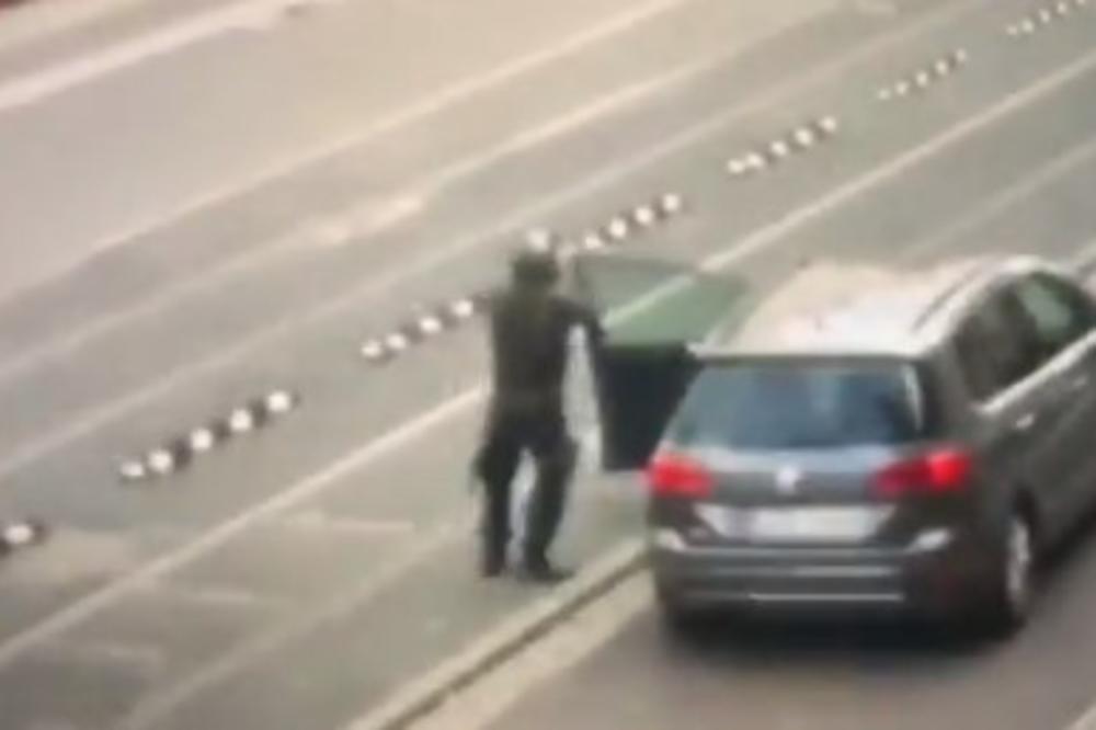 Može se videti muškarac, obučen u vojnu uniformu, kako izlazi iz vozila i počinje da puca. Sumnja se da su napad izvela dva muškarca.